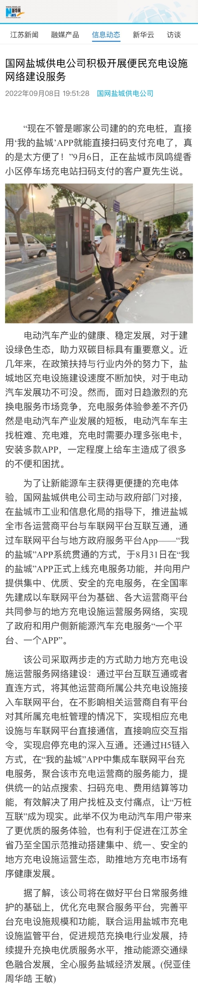 新华网:国网盐城供电公司积极开展便民充电设施网络建设服务