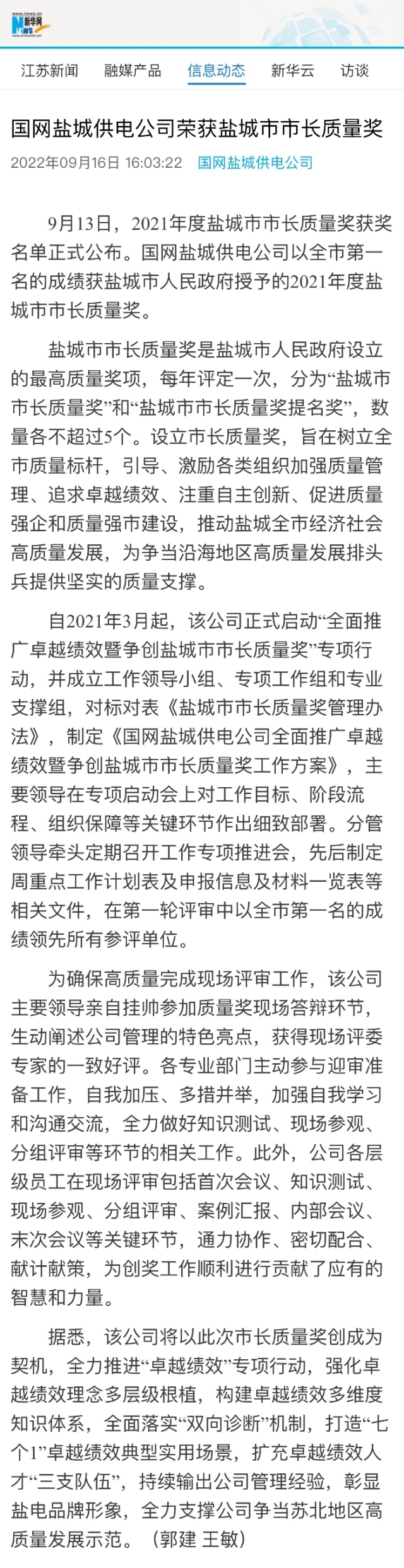 新华网:国网盐城供电公司荣获盐城市市长质量奖