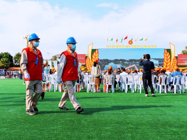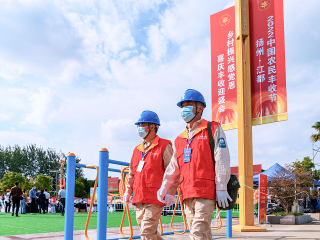 9月26日,在第五个中国农民丰收节来临之际,2022年中国农民丰收节扬州(江都)主会场开幕式在扬州市江都区武坚镇开幕。国家电网江苏电力(江都“都来电”)共产党员服务队提前谋划、周密部署,严格落实各项保电措施,全面保障丰收节开幕式的顺利举行。