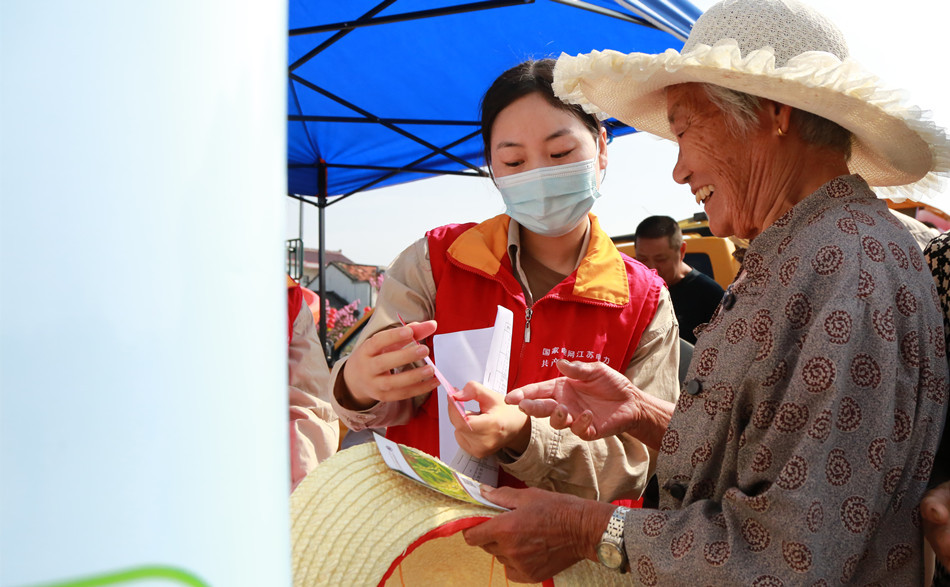 9月19日,江苏省丹阳市延陵镇柳茹村文化广场上,“丹阳小芳”共产党员服务队队员和村民们聚在一起,服务队队员利用电力工程车后备厢开展“(丹)电暖流”文明实践活动,一场知识竞答吸引了周边群众。