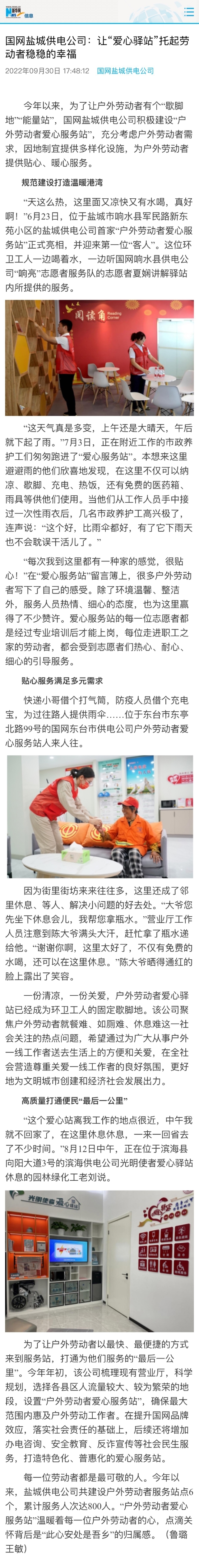 新华网:国网盐城供电公司:让“爱心驿站”托起劳动者稳稳的幸福