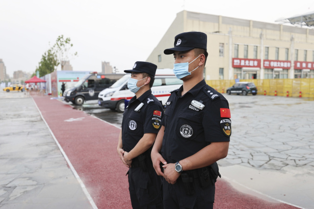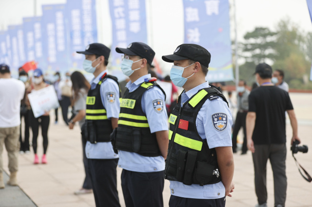 10月3日,民警在赣榆新城体育馆举办的房展会现场执勤。