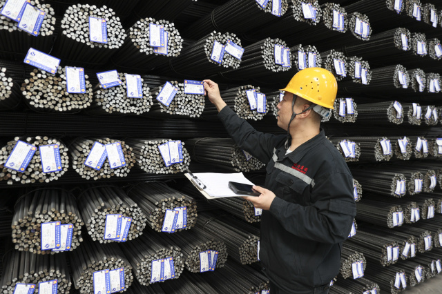 10月4日,镔鑫钢铁集团工人在点验外销钢材。