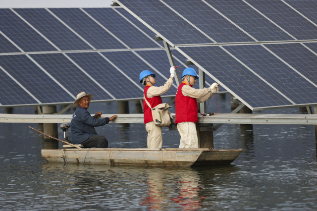 国庆长假期间,江苏省连云港市赣榆区许多劳动者依旧坚守岗位,为各项工作安全顺利运转保驾护航。10月1日,赣榆区供电公司工作人员在墩尚镇渔光互补淡水养殖区进行检修作业。