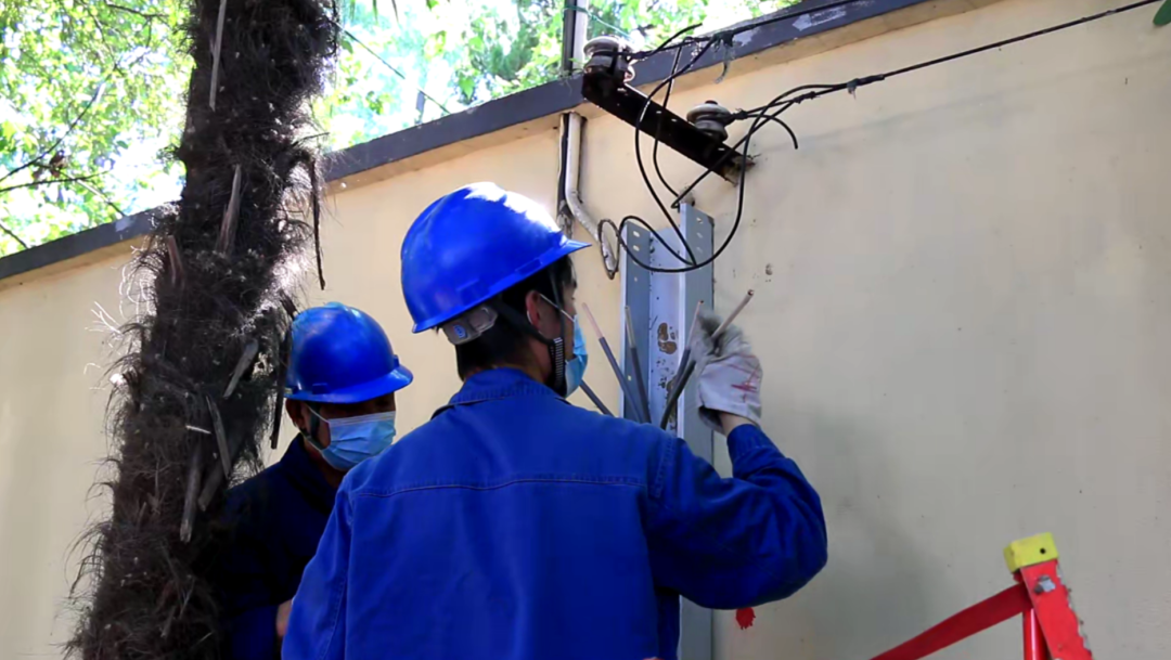 电力工作人员正在改造宁海路上的进户线