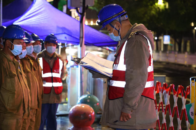 10月27日凌晨3点,在常州钟楼区南大街泰富百货附近,强光照明灯划破冷雨中的黑夜。灯光中,国网常州供电公司23名施工人员身着工作服、头戴安全帽,冒雨正在做施工前准备工作。稍后,施工人员将深入电缆井中进行电缆迁改割接搭头试验。