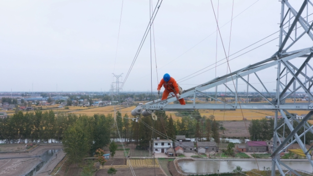10月26日,在潘荡-东益220千伏线路工程T73-T77段架线施工现场,盐城华源送变电工程有限公司员工趁着晴好天气,用牵张机开展T73-T77段上相与中相导线架设工作。“作业现场三条临近线路已全部由停电转检修状态,线路各相接地线挂接完好,天气微风无雨,架线工作正在有条不紊的顺利进行。工程目前正处于架线施工的高峰期和工程收尾的关键阶段。”现场工作负责人杨伟昊介绍。