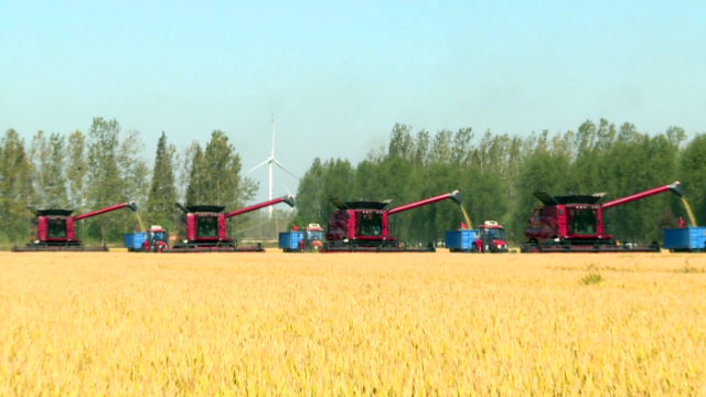 金秋十月,正值水稻收割的旺季,在江苏省新洋农场,数十台大型收割机在田间来回穿梭,6万亩水稻喜获丰收。