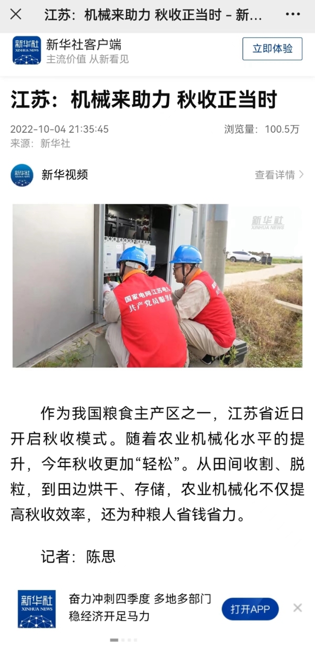 10月4日,新华社报道了《江苏:机械来助力 秋收正当时》