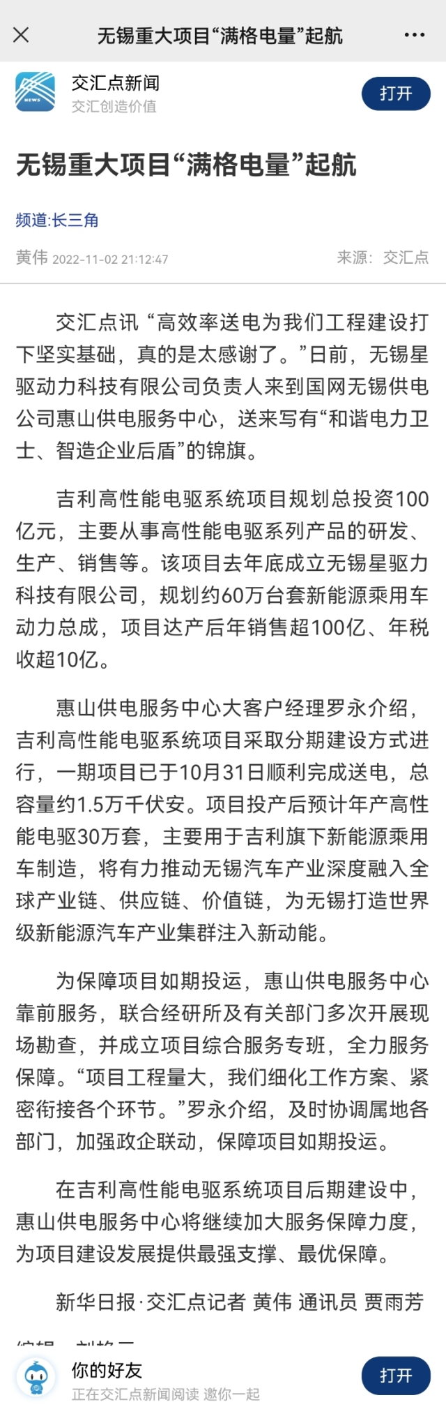 11月2日,交汇点新闻刊发了《无锡重大项目“满格电量”起航》。