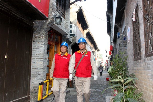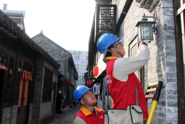 11月15日,国家电网江苏电力(高邮邮益思)共产党员服务队队员前往古镇老街的高邮市界首镇北大街义务维护街巷路灯,为老街居民的夜晚出行提供方便。