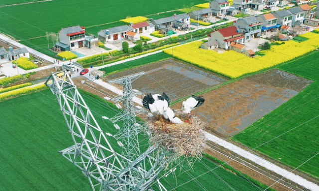 近年来,随着高邮地区生态环境持续改善,东方白鹳在高邮境内活动频繁,并屡屡在输电铁塔上安家。高邮市供电公司坚持电网安全与生态保护共赢理念,通过搭建人工鸟巢、设立防护挡板、组建志愿服务队等举措,走出了一条“护线爱鸟”的特色实践之路。高邮境内的东方白鹳数量从2003年的两三只,增长到如今的200多只。
