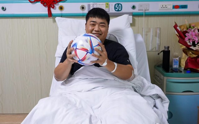 在采集造血干细胞前,薛伟杰也给受捐者回了一封信,并准备了一个礼物——卡塔尔世界杯用球“旅程”。