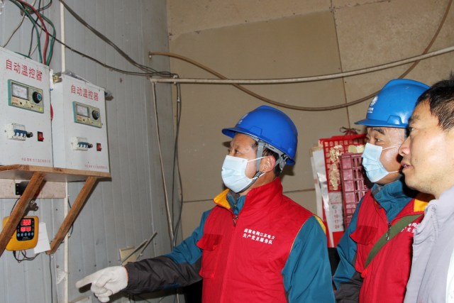 11月30日,高邮境内室外最低气温-1℃。国网高邮市供电公司甘垛供电所员工任秀章和从马乙赶到位于甘垛镇沙贯村的琴龙蛋鸡养殖场,义务维护鸡舍取暖的用电设备,并对养殖场内的备用发电机进行检查。