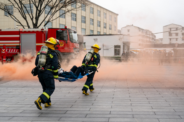 10时50分,消防演习正式开始。本次演习采用烟雾弹和小油盘点火,模拟3楼裙楼处装修现场起火、地下车库电动汽车自燃。浓烟扩散后,感烟探测器动作,火灾报警装置发出报警。消控室值班员核对报警信息,确认了火灾位置,通知志愿消防队组织灭火,并拨打119报警电话。同时,大楼消防广播重复播放撤离通知,各楼层楼长参照演习方案,迅速组织员工紧急疏散,全体人员安全、有序疏散至大院广场安全区域。各层楼长统计撤出人员信息时,发现两名员工被困于裙楼楼顶。公司志愿消防队和医疗救护组配合赶到的消防队伍,成功将被困人员救出。疏散演练活动虽然时间不长,但达到了“响应及时、疏散有序、操作正确”的效果。