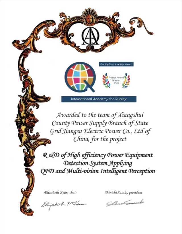 1月5日,从国际质量科学院(IAQ)获悉,国网响水县供电公司“响亮”代表团队的“应用QFD的多目智能视觉感知的高效电力设备检测系统研发”项目荣获国际质量促可持续发展奖,成为本次评选中唯一一支获奖的中国队伍,也是国家电网公司首次荣获该项荣誉,实现历史性突破。
