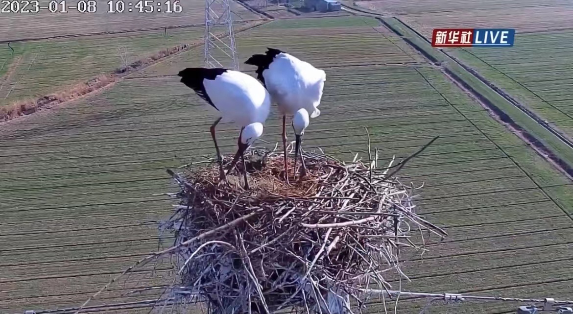1月8日上午,新华社客户端以“生态中国 | 东方白鹳铁塔越冬‘秀恩爱’”为题,对这对相亲相爱的“网红大鸟”进行了时长约40分钟的直播。镜头里,先是一只东方白鹳站立在高高的鸟巢里,用长而尖的嘴巴叼起树枝,认真捯饬加固着自己的家。没过多久,另一只东方白鹳也回归家中,它们互相依偎,欣赏着高空之下浅浅绿意的麦田,冬日的风吹动了它们的羽毛,十分浪漫温馨。