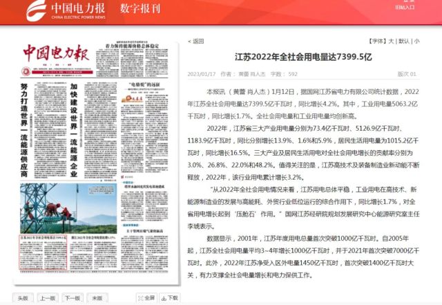 中国电力报:江苏2022年全社会用电量达7399.5亿-东台报业网
