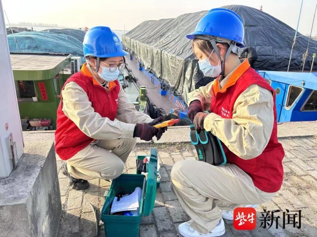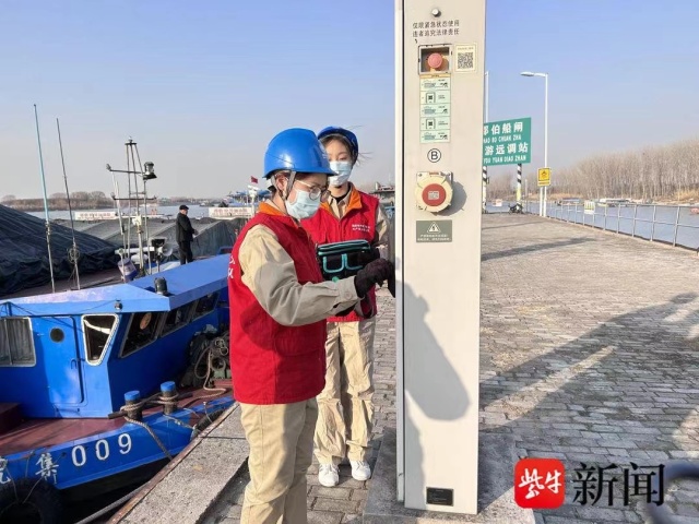 “供电公司来人了,大家用电就不要烦啦!”1月19日下午,扬州市江都区邵伯船闸航管中心副主任庄俊来到远调站,告诉正在等待用电的船民。随他同来的是两位身穿共产党员服务队服装的青年女工,她们是国网扬州市江都区供电公司员工樊君妍、孙袁辰,今天专程来到远调站对15个岸电充电桩进行检修的。“我们每