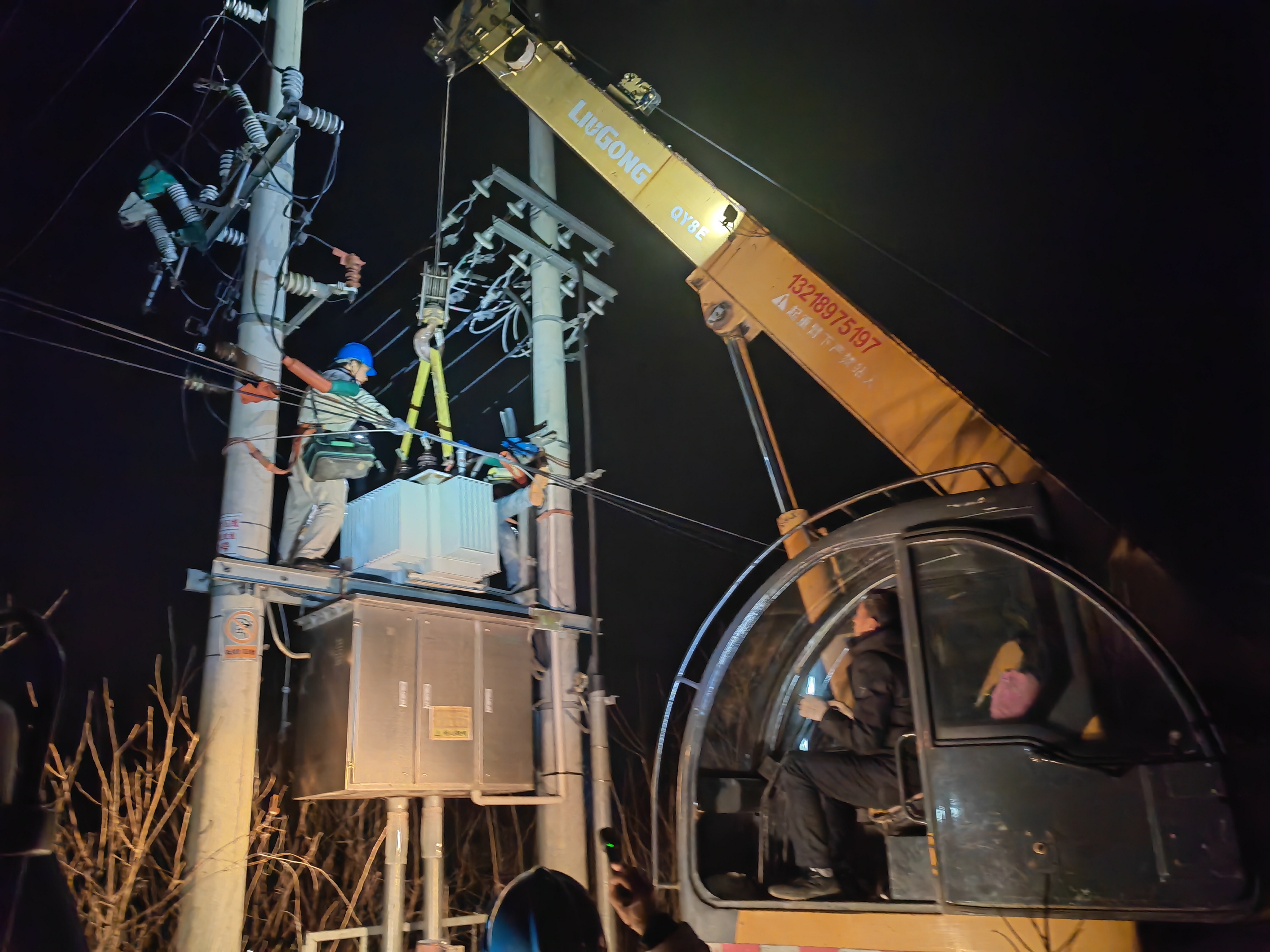 在抢修工作现场,5名抢修施工人员,挑灯夜战,从做安措开始,到拆除损坏的旧配变、吊装新变压器、更换熔丝具、搭接电缆头,各项工作都在紧张而有序地进行着,经过近3个小时的奋力抢修,至当晚20点35分,三相熔丝一次性合闸成功,整个台区恢复供电,40余户灯光重现光明。