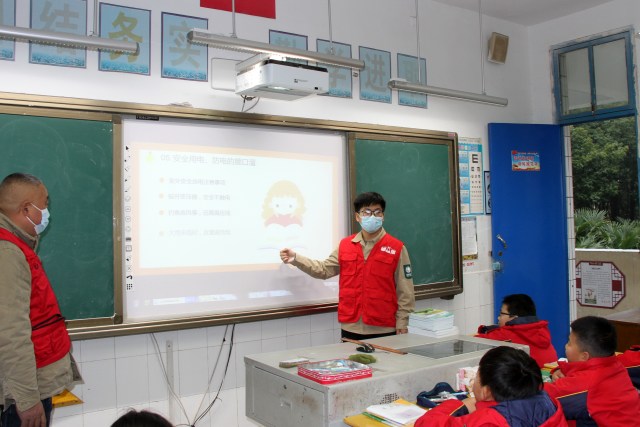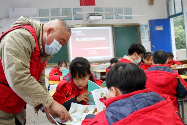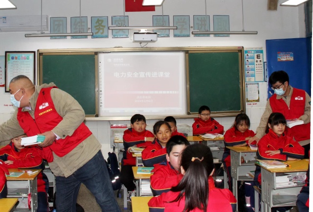 2月6日,中小学生开学第一天,国网高邮市供电公司汤庄供电所员工前往汤庄镇汤庄小学五(1)班,通过播放小视频、发放笔记本等形式,向该班学生宣讲防范触电、电力线下防风筝等安全用电及电力设施保护知识。