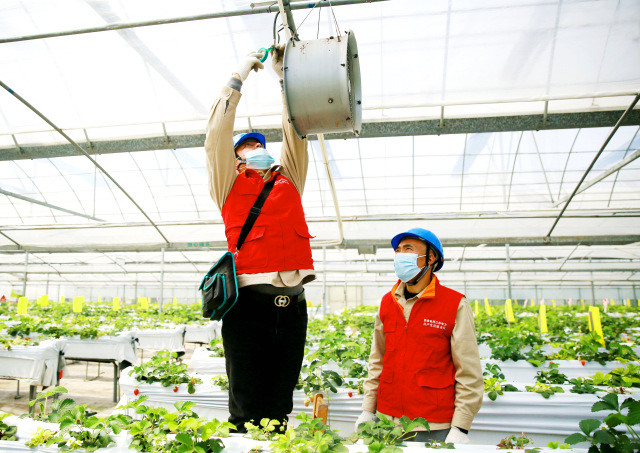 服务队队员检查通风设备电力线路2月3日,国网扬州市江都区供电公司“都来电”共产党员服务队来到吴桥镇,对位于该镇的江都现代农业产业园的用电设备进行公益检修。目前正值草莓采摘旺季,不少游人前来采摘草莓,服务队队员开展公益检修,保障了设备的安全运行。队员检查肥水一体灌溉设备电动水泵