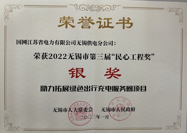 1月11日晚,2022无锡市第三届“民心工程奖”颁奖仪式在广电集团隆重举行。公司申报的“助力拓展绿色出行充电服务圈项目”获评无锡市年度“民心工程奖”银奖。这也是继去年居住区电力设施焕新提升工程获评“民心工程奖”金奖后,公司在民生工作领域取得的又一项重要荣誉。