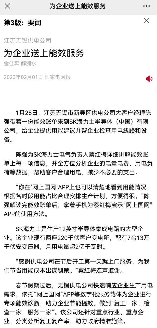 《国家电网报》:江苏无锡供电公司为企业送上能效服务