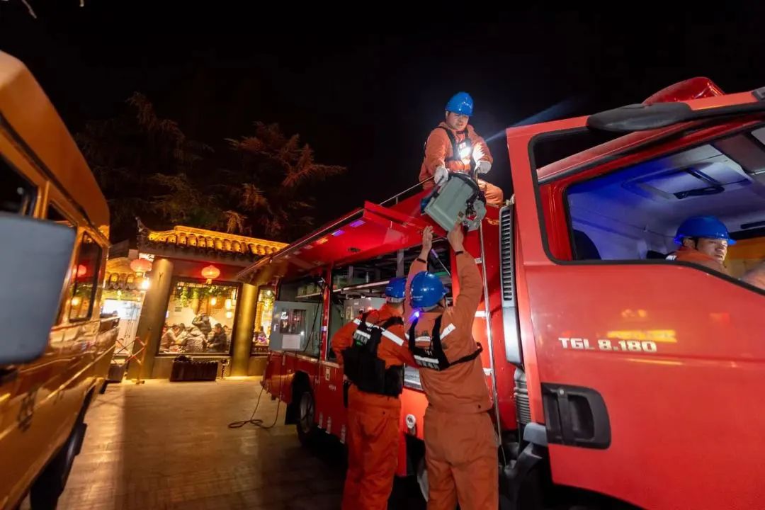 “慢一点、再慢一点,注意角度。”站在负责操控高射灯的队员身边,张代飚不停地望向车身上缓缓升起地灯架。“这八盏射灯全部开启时,可以保障对面大成殿周围的照明。”张代飚说,“灯会保电不同于其他保电,是人命关天的大事!灯会开始后,每天都有数不清的人来观灯,一旦出现用电故障,不仅影响花灯展示,万一失去照明,发生踩踏事故,后果不堪设想。”