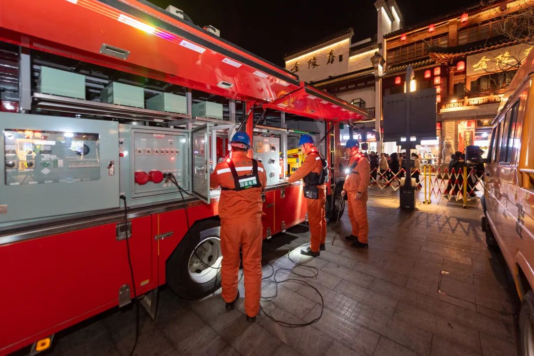 “要确保万无一失!”张代飚介绍,“今年灯会前,我们对配电变压器和线路展开了全面测温、测负荷工作,及时消除安全隐患。灯会保电期间,值守在现场,采用应急照明车和照明无人机,随时应对突发情况。”在乌衣巷口的设备车前,张代飚和队员整理好工作服,相互检查着穿戴好值守装备、戴好安全帽。