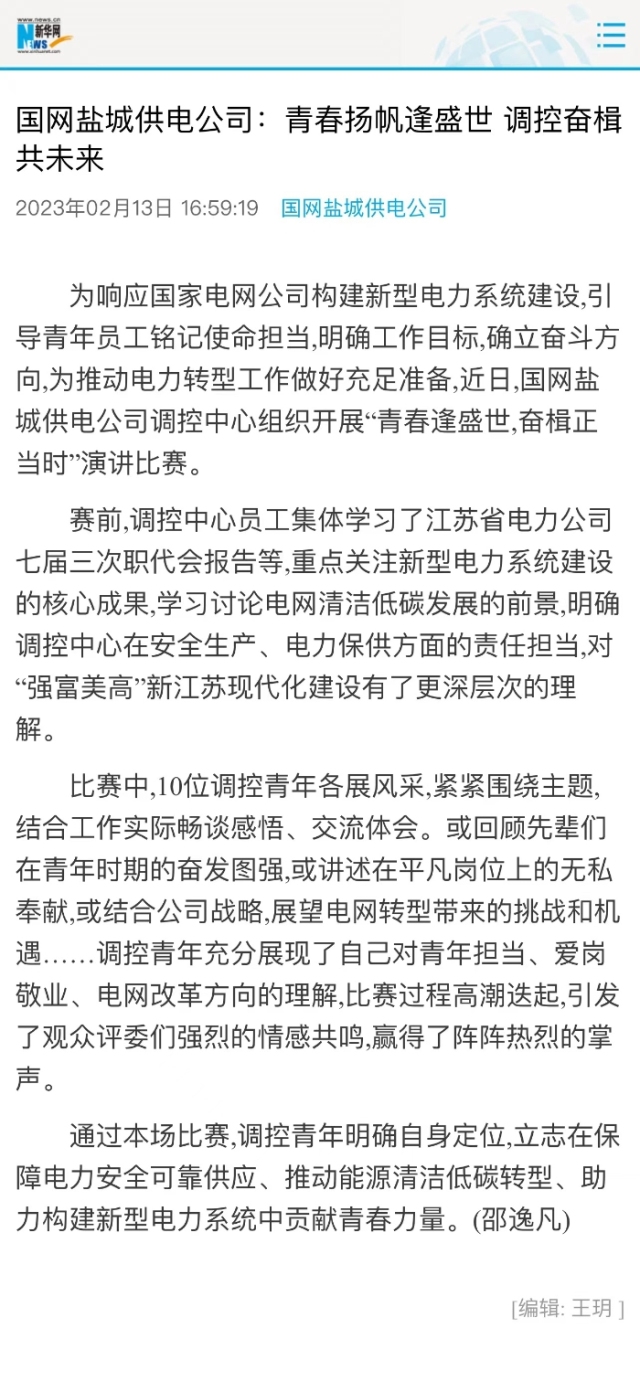 新华网:国网盐城供电公司:青春扬帆逢盛世 调控奋楫共未来