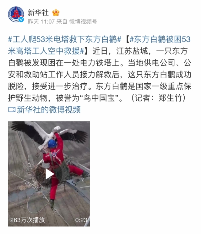 新华社:工人爬53米电塔救下东方白鹳-东台报业网