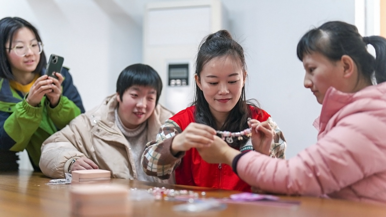 3月3日,方天公司组织青年志愿者前往南京益智多残疾人服务中心,向残障儿童赠送学习用品、生活物资等,并与他们一同开展跳绳、手工等活动。图为志愿者带领残障儿童制作手工艺品。(龚燕)