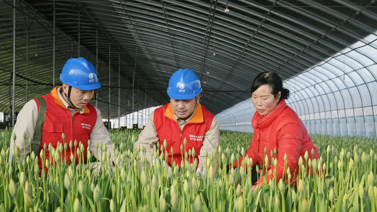 3月2日,国网东海县供电公司党员志愿者来到该县双店镇鲜切花基地,查看用电设施运行情况,帮助排除用电隐患。图为志愿者向花农了解用电需求。(陈全仁)