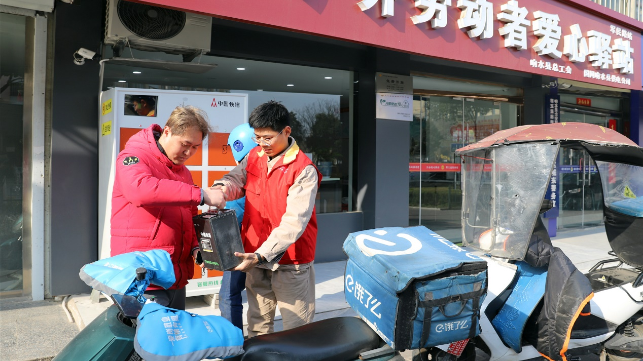 3月2日,在国网响水县供电公司设立的户外劳动者爱心驿站,国网江苏电力(盐电铁军·响亮)共产党员服务队队员黄万里指导外卖员使用换电柜。该驿站面向户外劳动者提供休息、充换电等综合服务。(林汀)