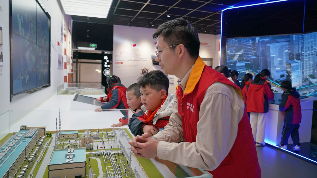 3月1日,国网江苏营销服务中心开展“志以‘营’火愿暖春光”学雷锋活动,组织志愿者带领南京力行小学学生参观电力体验馆,开展电力科普课堂,并邀请专业人员为学生检查视力,免费为30名学生配置了眼镜。图为志愿者在电力体验馆内为学生讲解电力知识。(朱波)