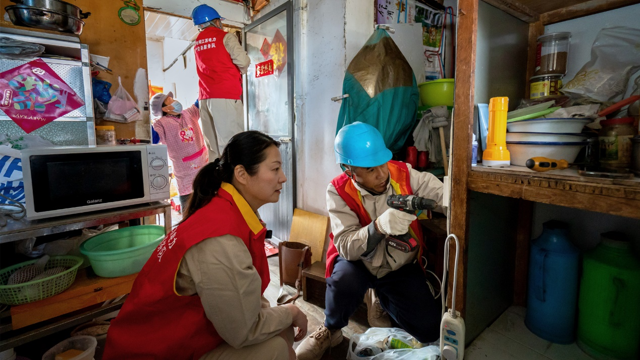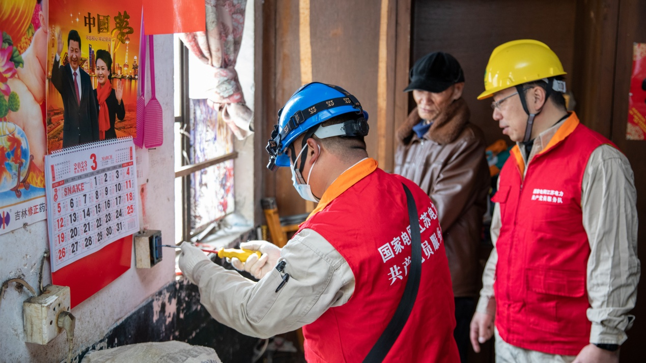 3月2日,国网苏州供电公司韩克勤党支部牵头组织与来自电、水、气、讯等公用事业单位和公安机关的6个党支部开展结对共建,联合为困难群体办实事解难题。图为韩克勤带领青年党员来到姑苏区虎丘街道湖田社区五泾新村三里2号,为一名79岁独居老人家中加装插座。(黄飞英 谢鹏)