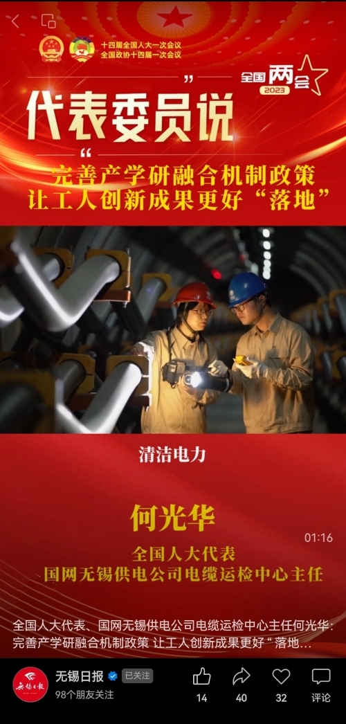 《无锡日报》:全国人大代表、国网无锡供电公司电缆运检中心主任何光华 完善产学研融合机制政策 让工人创新成果更好“落地”