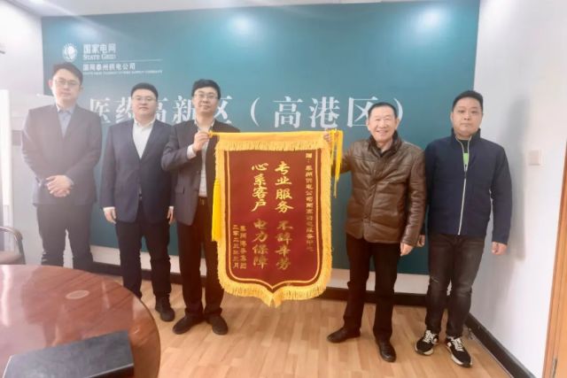 “专业服务,不辞辛劳,心系客户,电力保障”近日,江苏泰州港务集团有限公司给公司两高供电服务中心送来锦旗感谢他们为港务集团送来及时电这是两高供电服务中心自2022年7月成立以来收到的第一面锦旗2月26日晚上两高供服中心大客户经理韩艺接到港务局集团电话“韩经理,我们集团的停电时间和内部货运航
