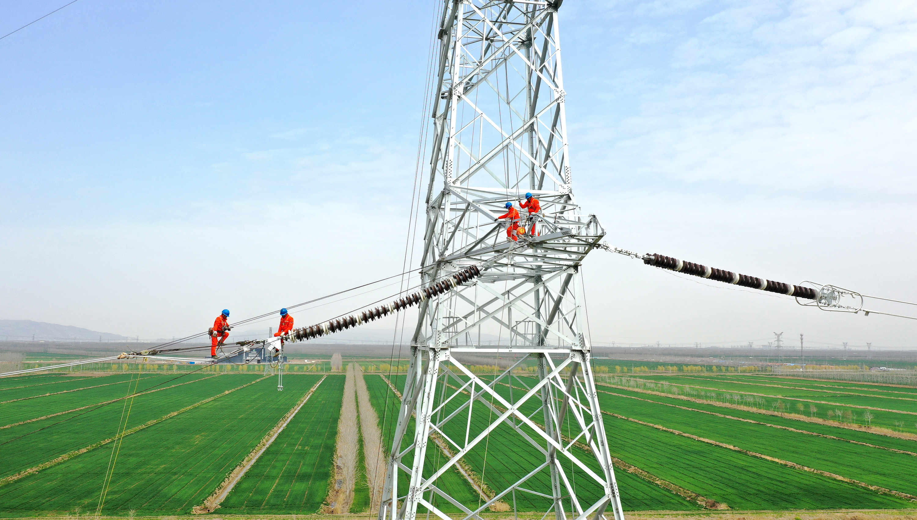 2023年3月25日,在江苏省连云港市田湾核电送出加强工程现场,国网江苏电力工人在65米高空架设500千伏输电线路。田湾核电送出加强工程是国家重点能源项目配套工程,项目建成投运后,将实现田湾核电输送能力的大幅提升,为用电负荷高峰到来时,华东地区的能源安全稳定供应提供坚实保障。
