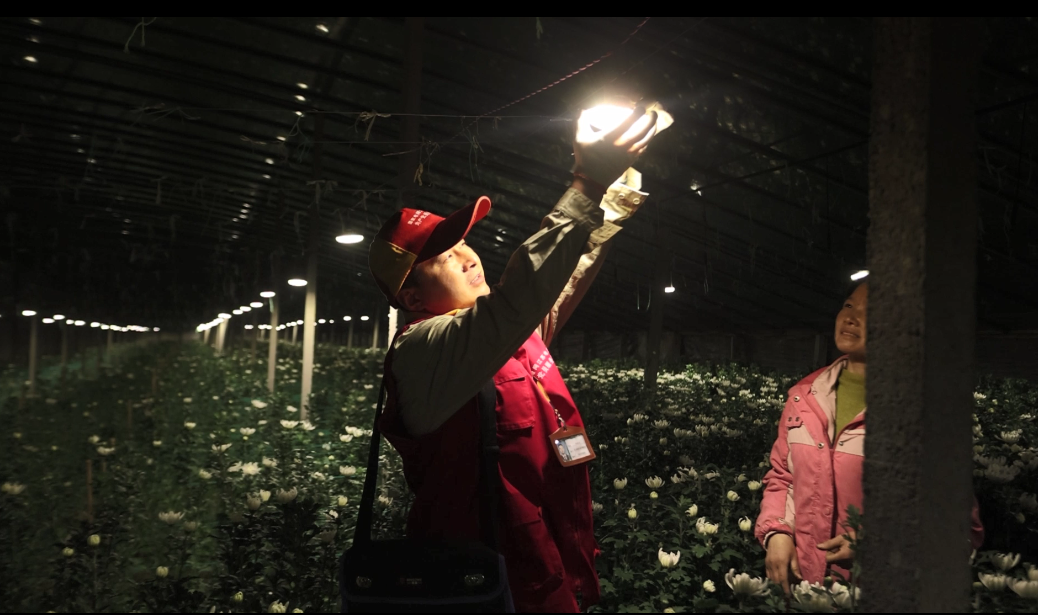 “每年清明、七月半和冬至是菊花销售最旺的时候,菊花要想销量好,品质得有保障,菊花喜光,光照不足将影响花蕾的形成,进而影响开花时间以及整体观感,为了使菊花种植的温度、湿度和光照全部实现智能化控制,在当地供电所的帮助下,我们每个智能大棚都安装了自然通风系统、遮黑系统、补光系统和灌溉系统等,而且鲜花成批采摘后,都要入冷库保鲜,所以生产过程中,每一样都离不开电。”张九田边说边示范,按下遮光系统控制电钮,大棚内的白天瞬间变成黑夜,再按补光系统控制电钮,整排补光灯齐刷刷亮起。