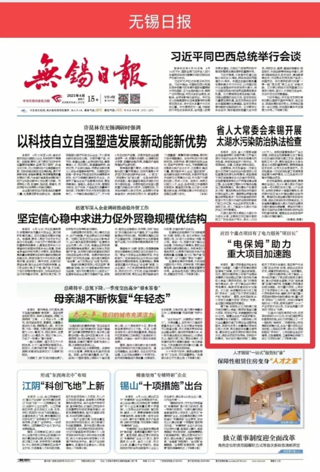《无锡日报》:近百个重点项目有了电力服务“项目长” “电保姆”助力重大项目加速跑