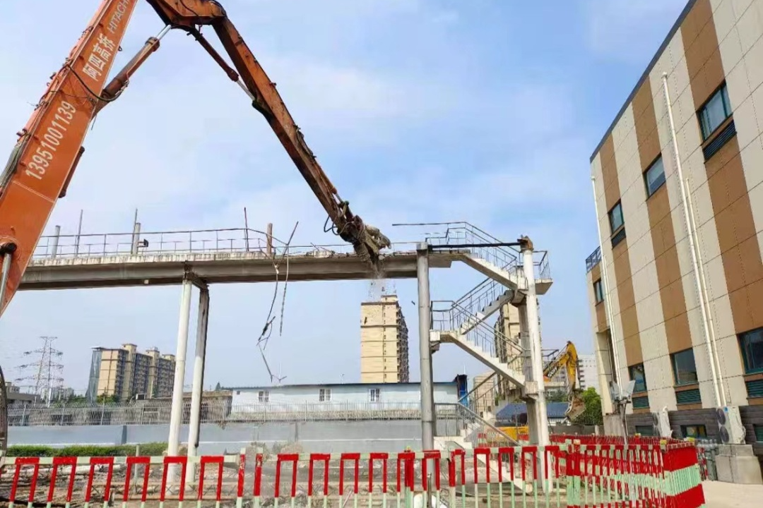 为加快工程进度、降低安全风险,现场拆除高处建筑物时,选用长臂的混凝土液压粉碎钳。