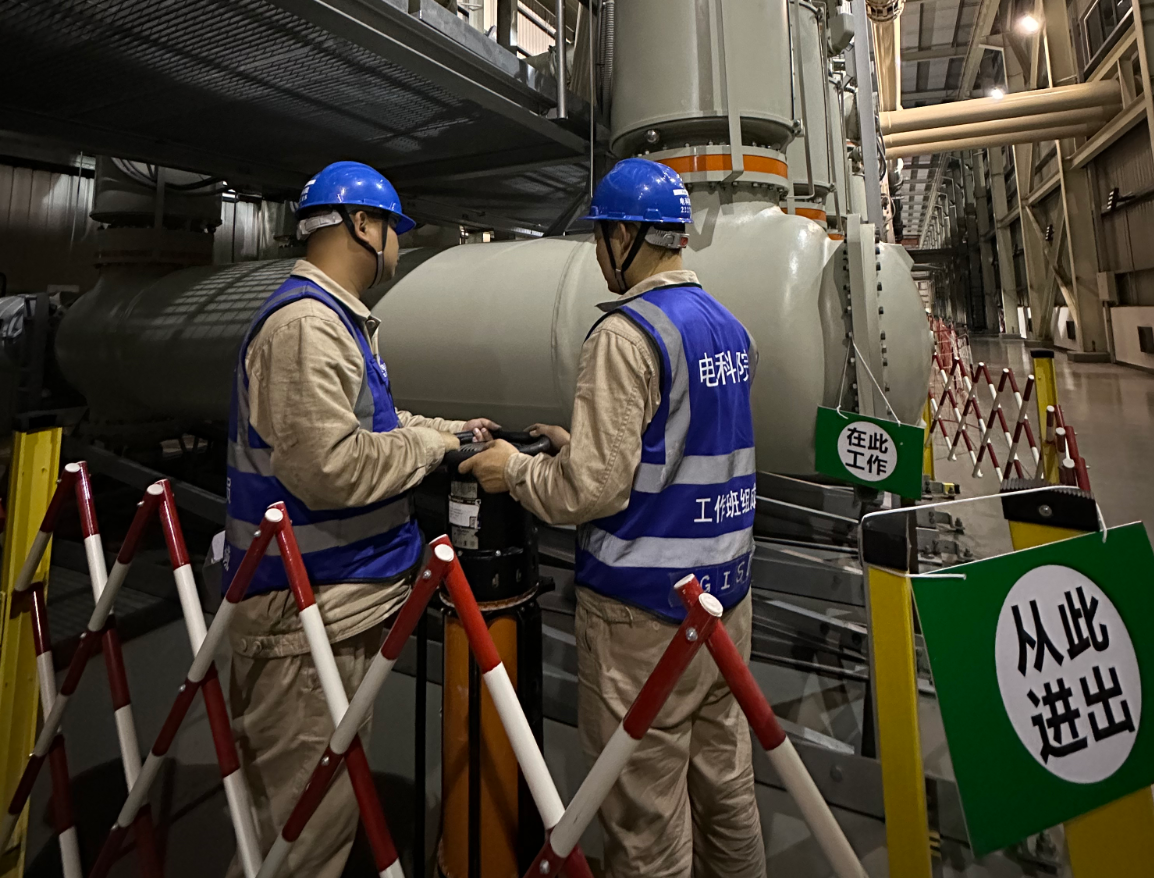 4月30日,国网江苏电科院工作人员正在±800千伏特高压苏州换流站年度检修现场,对气体绝缘金属封闭开关设备(GIS)断路器开展X射线探伤工作,透视设备内部结构,以此准确评估内部缺陷,及时预警故障风险。(郭东亮)