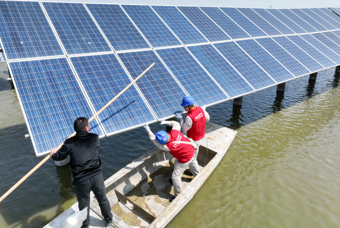 4月29日,国网连云港市赣榆区供电公司工作人员正在赣榆区墩尚镇一处渔光互补光伏电站检查设备运行情况。(孙岩)