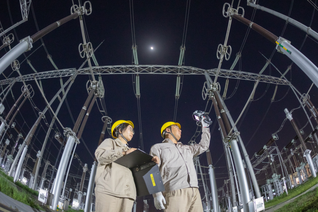 4月30日晚,国网扬州供电公司500千伏变电运检中心江都变电运维班值班员工作人员正在500千伏江都变电站进行负荷晚高峰特巡检查。(王斌)