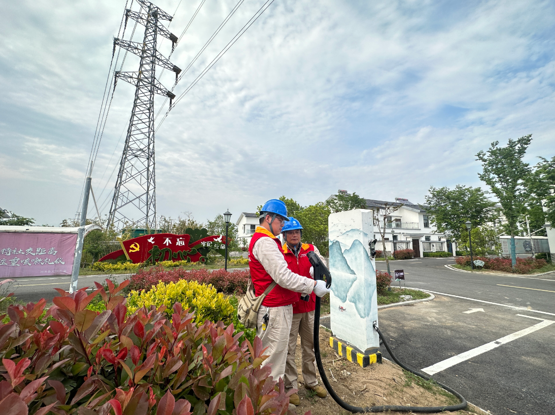 4月29日,宿迁泗洪县城淮供电所工作人员正在检查石集乡柳山湖景区汽车充电桩设备,确保游客绿色出行。(石春燕)