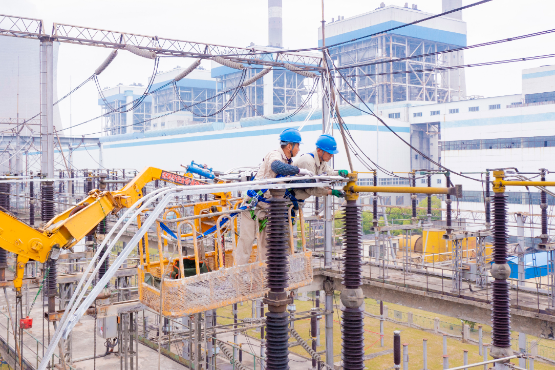 4月29日,淮安公司工作人员正在华能淮阴第二发电厂220千伏升压站实施母线增容改造工程。(邵帅)