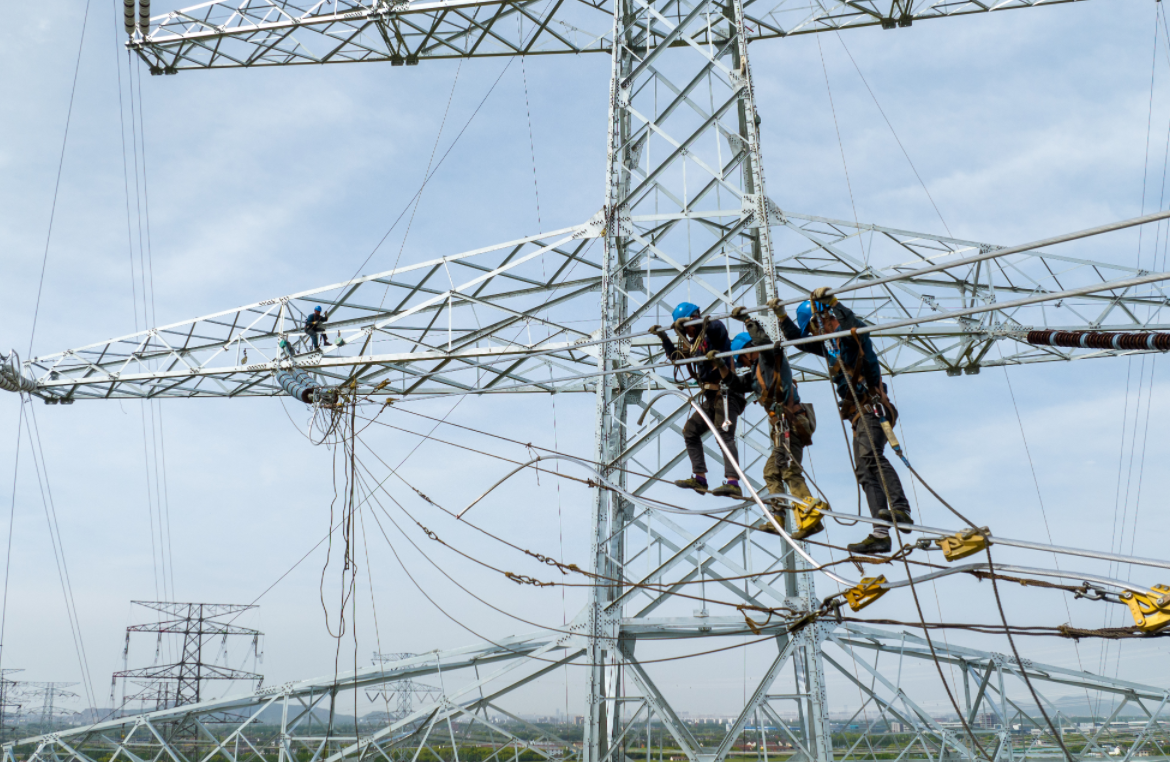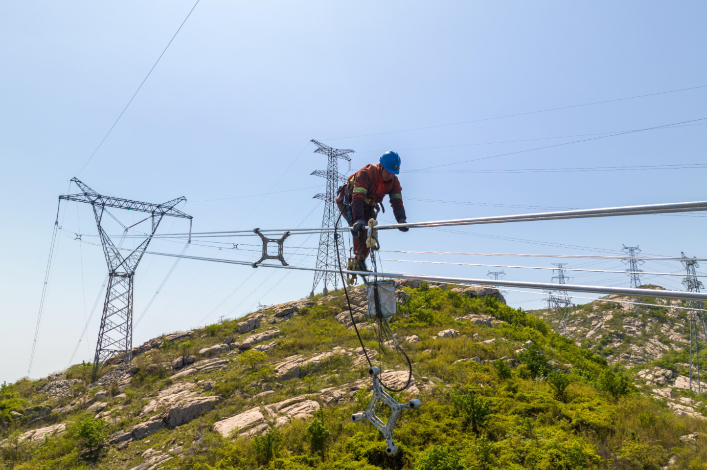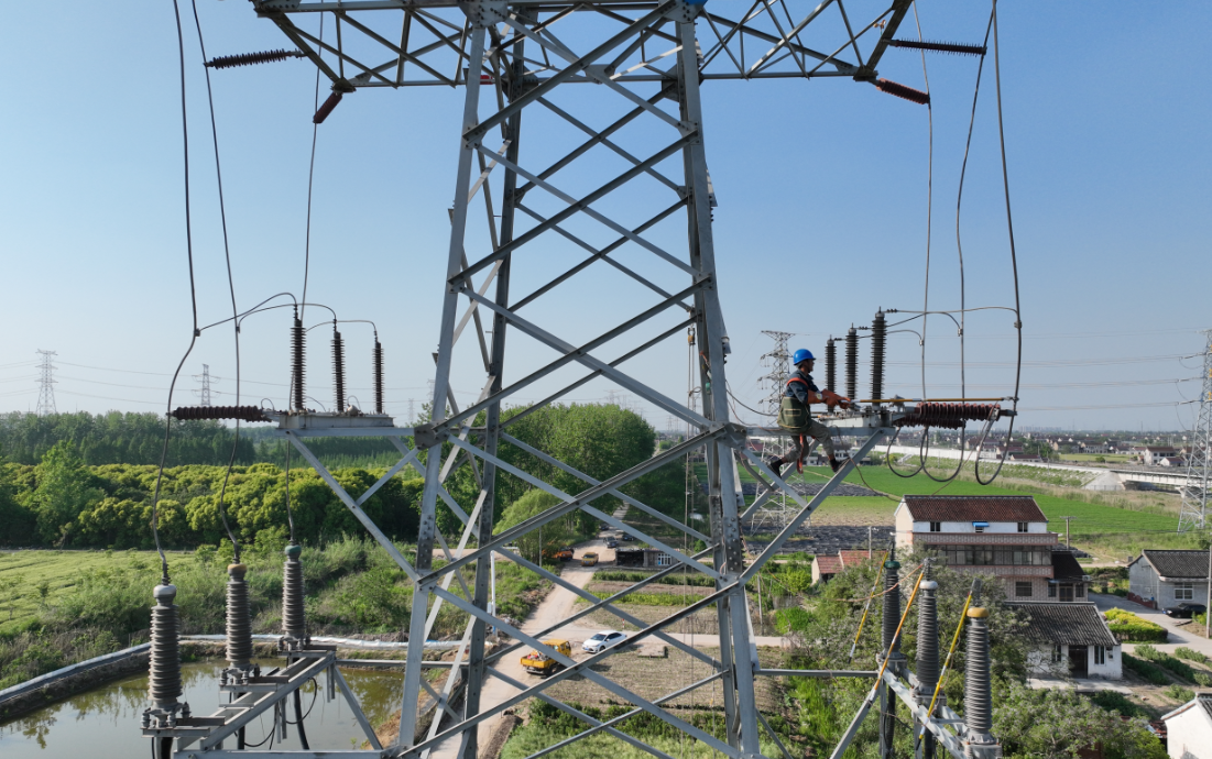 4月30日,连云港田湾核电500千伏送出加强工程现场,工作人员正在500千伏田圩5216线路上安装间隔棒。(董小强 王雨萌)