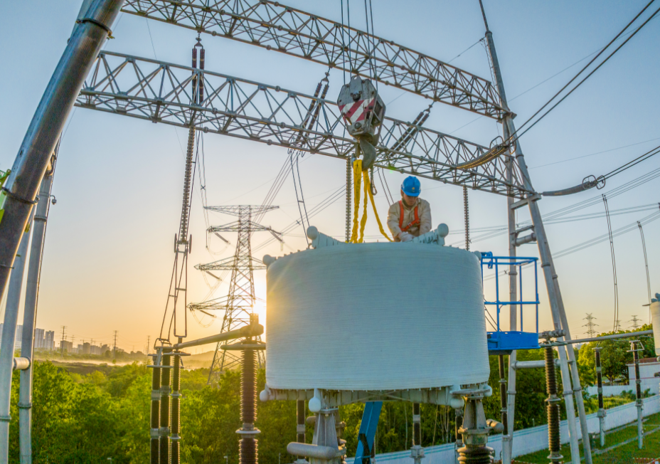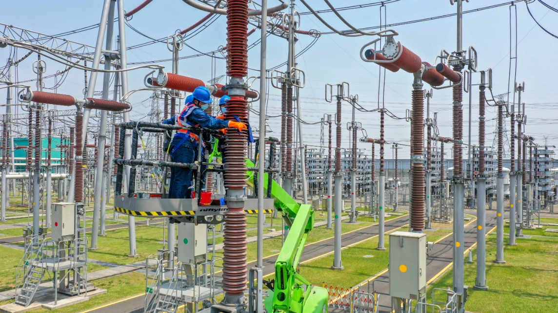 5月1日,在500千伏东善桥变电站检修现场,国网南京供电公司工作人员正在进行拆除秦桥5688线路阻波器作业。(杜懿)